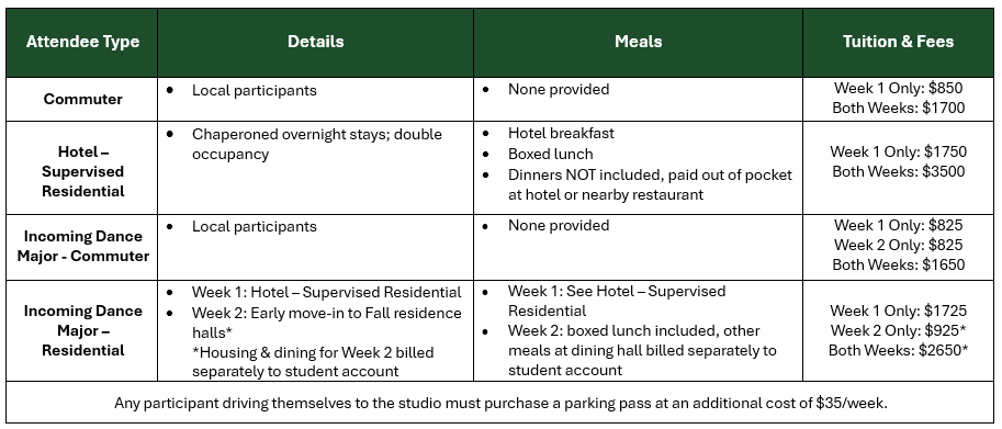 For residential students, breakfast and lunch are included in the price of room and board fees. Each evening, dancers will dine as a group at the hotel or nearby restaurants. Dinners are not included in the cost of room and board and must be purchased by each individual using cash or credit card. Commuter students should bring their own lunch. Commuter students are welcome to join residential students for dinners, but must provide their own payment and transportation.